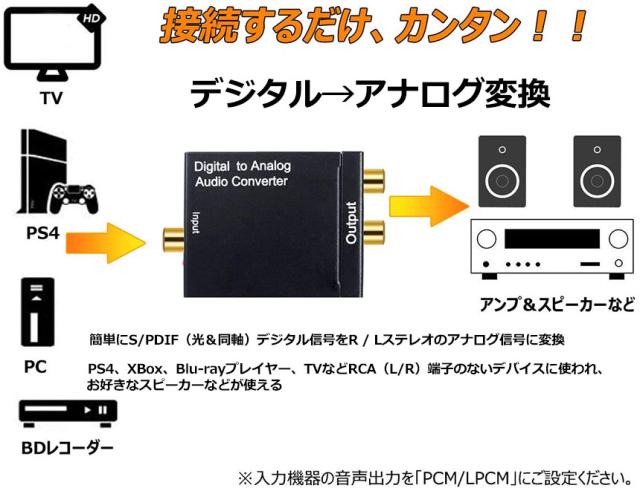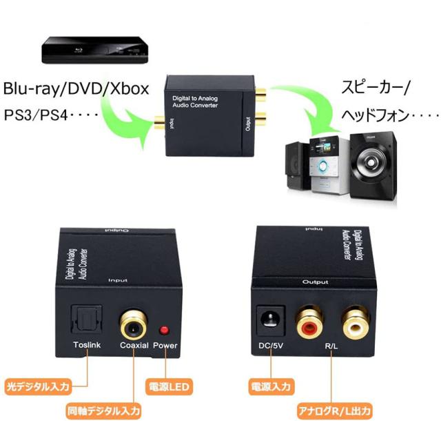 【デジタル→アナログ変換】 簡単にS/PDIF(光&同軸)デジタル信号をR / Lステレオのアナログ信号に変換します。PS4、XBox、Blu-rayプレイヤー、TVなどRCA(L/R)端子のないデバイスに使われ、お好きなスピーカーなどが使えるようになります。