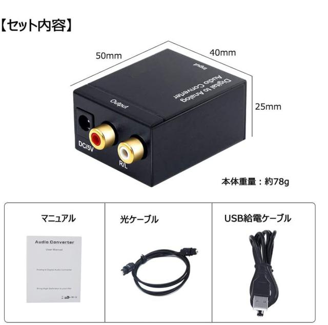 DACデジタル(光&同軸) から アナログ(RCA) オーディオ変換器 変換コネクター オーディオコンバーター 光デジタル アナログ 変換器 同軸 変換 Digital to Analog Converter 光ケーブル付き