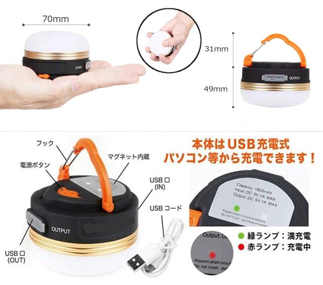 【電球色のLEDランタン】:太陽や炎のように陽気で暖かなオレンジ色の電球を採用、お部屋での普段使いから、アウトドアシーンや緊急時まで、様々な場面で活躍する優れもの。USB給電ライプで、USBケープルを接続して充電可能。1800mahのリチウム電池が内蔵されており、長時間点灯可能となります。*電源指示灯のランプが緑色点滅→充電中、緑色点灯→充電完了、赤色点灯→点灯中。