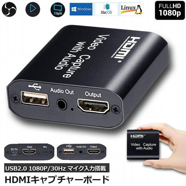 HDMI キャプチャーボード HDMIパススルー出力 3.5mm音声出力 MIC音声入力搭載 USB2.0 1080P 30Hz ゲームキャプチャー ビデオキャプチャカード ゲーム実況生配信 画面共有 録画 軽量 DSLR ミラーレス S4 Nintendo Switch、Xbox One、OBS Studio対応