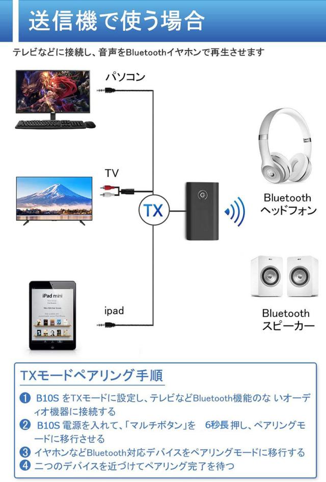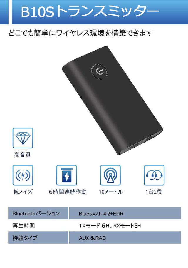 Bluetooth5.0 トランスミッター レシーバー 1台2役 送信機 受信機 充電式 無線 ワイヤレス 3.5mm オーディオスマホ テレビ TXモード輸出 RXモード輸入 音楽 送信機 受信機 ブルートゥースios iPhone Android 古いコンポ 車載AUX スピーカー等に適用 B10S
