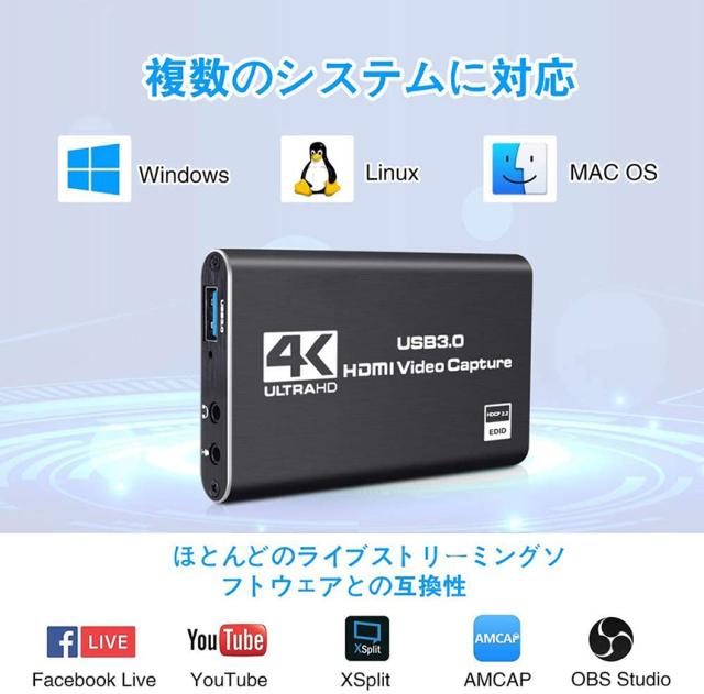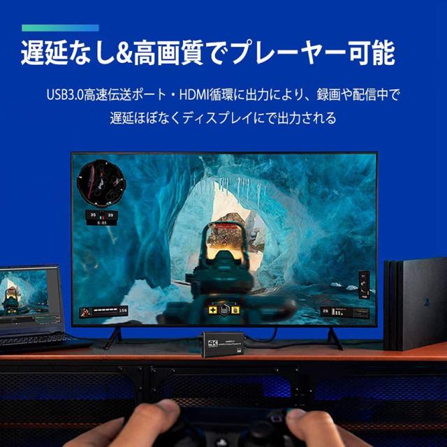 【パッケージの内容】キャプチャ、USB 3.0ケーブ、説明書。 HDMIループアウトポートを使用する際に遅延することがありません。 ライブ配信でゲームをプレイする場合、HDMIループアウトポートは非常に役に立ちます。USB3.0高速転送ポートを介してTwitch、Youtube、OBSなどでライブストリーミングを転送しやすくなり、デバイスで動作します。最新4K 60HZパススルー対応しているバージョンで、 HDMI循環に出力により、1080p/60fpsの高画質映像を録画しながら、究極のゲーム体験を存分に楽しめます!