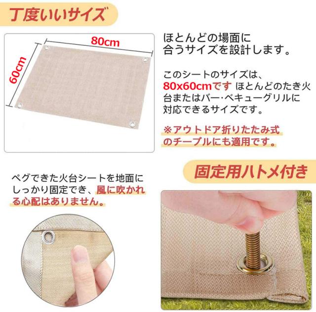 【多用途】直火禁止キャンプ場での焚き火台用ベースシートとして、また、卓上やテント内での バーナー使用時にご使用いただけます。バーベキュー焼肉や卓上コンロの防火に!芝生を保護する目的で焚き火台の下に敷いてます。溶接火花養生シート、各種防火遮断シート、バーナーシート、耐炎カバー類として自由にご使用いただけます。※必ず耐熱温度内でご使用ください。また断熱シートではないため地面への熱を遮断できるわけではありません