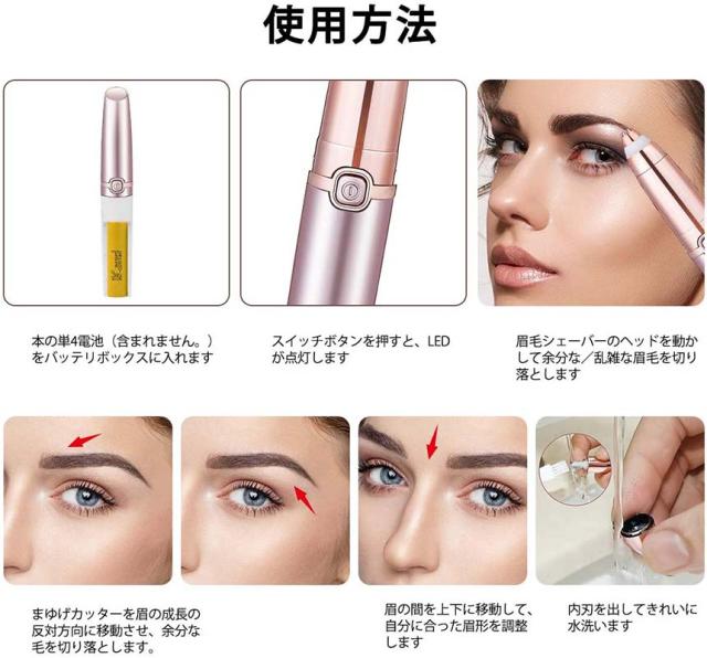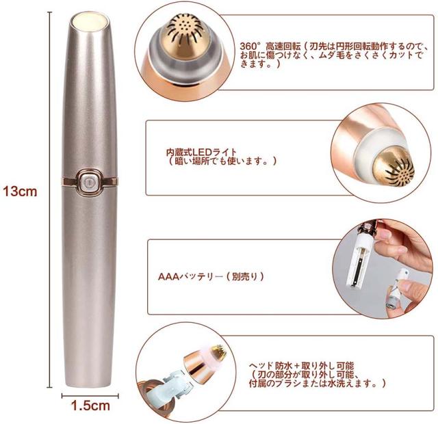 【肌を傷つけない&痛くない】普通の眉毛シェーバーと違いって、こちらの眉毛シェーバーは最新型360°盲点がない電動回転式内刃を採用し、お肌を傷つけにくいです。初心者や肌の損傷を気になる方に最適です。【二種類刃先&一本多用】眉毛カッターは、細かい部分やはみ出した眉毛もピンポイントで狙い撃ちできます。眉毛だけではなく、フェイス、耳毛、腕、指などの細かいうぶ毛をスッキリ剃れる多機能電気シェーバーです。