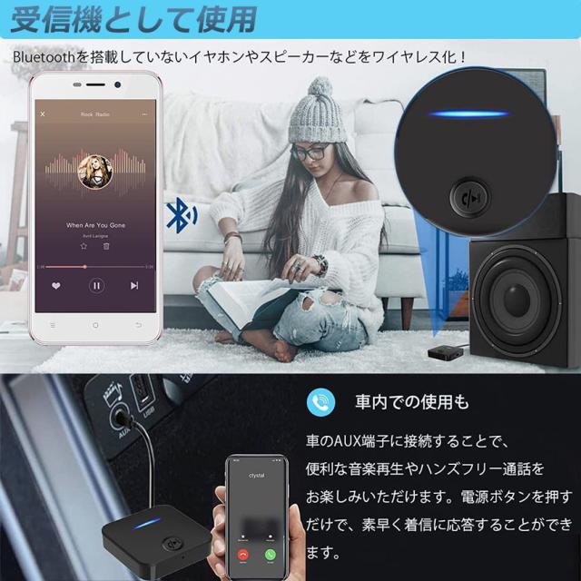 【一台二役】本製品は送信と受信の両方に使用可能なBluetoothオーディオトランスミッター&Bluetoothオーディオレシーバーです。送信機モードや受信機モードはワンタッチで簡単切替えできます。送信機(TXモード):Bluetoothに対応していない携帯オーディオプレイヤーやテレビと繋いで、Bluetooth対応のスピーカーやヘッドセットなどと接続ができます。受信機(RXモード):Bluetoothに対応していないイヤホンやヘッドホンを繋いで、Bluetooth対応のスマートフォンや携帯オーディオプレイヤーなどと接続ができます。※通話はできます。【多機種対応&Bluetooth V5.0】一般的な3.5mmイヤホンジャックを採用しているので、3.5mmプラグ/ジャックのイヤホンやオーディオ機器(TV、パソコン、カーオーディオなど)に対応します。また、Bluetoothバージョン5.0では通信速度、範囲、容量がそれぞれ大幅に向上したことで、遅延を最小限に抑え、映像と音声の時間差を感じること無く快適に楽しめます。Bluetoothに対応していないテレビに最適です。
