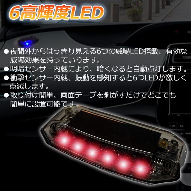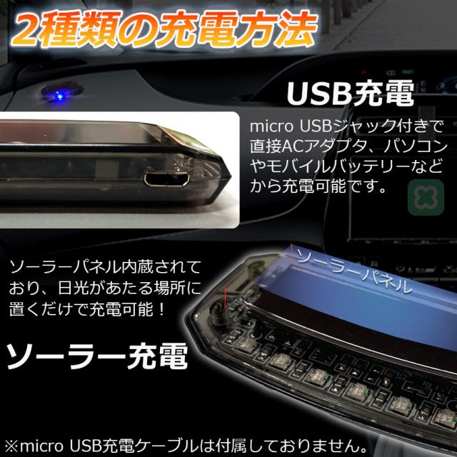 【LED発光で威嚇】本製品はLED発光で不審者を威嚇する車用セキュリティです。【ソーラー&USB充電】太陽光があるかぎり、防犯し続けます、ソーラー電源を内蔵しているため、日中は自動で充電し、暗くなると自動で点滅を開始。太陽光があるかぎり、防犯し続けます。micro USBでも充電可能です。