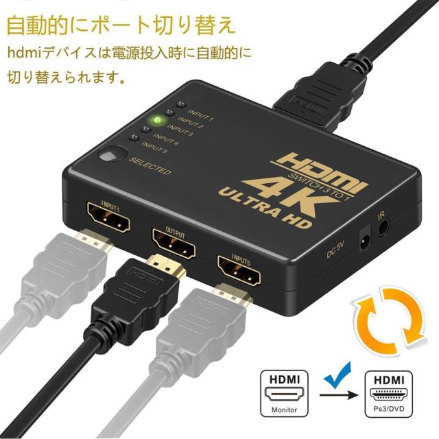 HDMI 切替器 分配器 5入力1出力 4K セレクター 1080p 3DフルHD対応 自動手 動切り替え リモコン switch Blu-Ray DVD DVR Xbox PS3 PS4 Appleなど対応