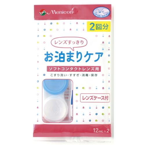 お泊まりケアは、ソフトコンタクトレンズを使用しているユーザー様が、急な外泊、出張や緊急時に2泊(2回)分ご使用いただけるケア用品となります。そしてソフトコンタクトレンズに必要な消毒成分も含まれております。また、お泊まりケアは、カラコンを含む全てのソフトコンタクトレンズをケアすることができ、持ち運びができるレンズケースを同梱