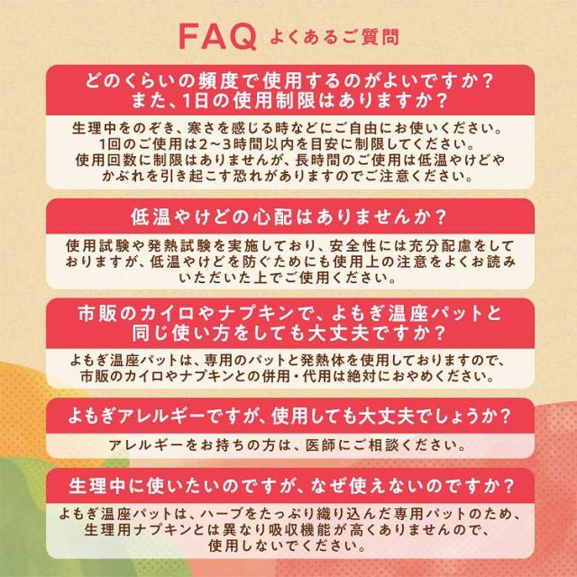 | ★よもぎ温座パット専用発熱体(原材料) 鉄粉、活性炭、珪藻土、食塩、水、トルマリンパウダー ★よもぎ温座パット専用よもぎパット(構成材料) 表面材:不織布/パット内部:よもぎ・ハッカ・ドクダミ配合シート |
