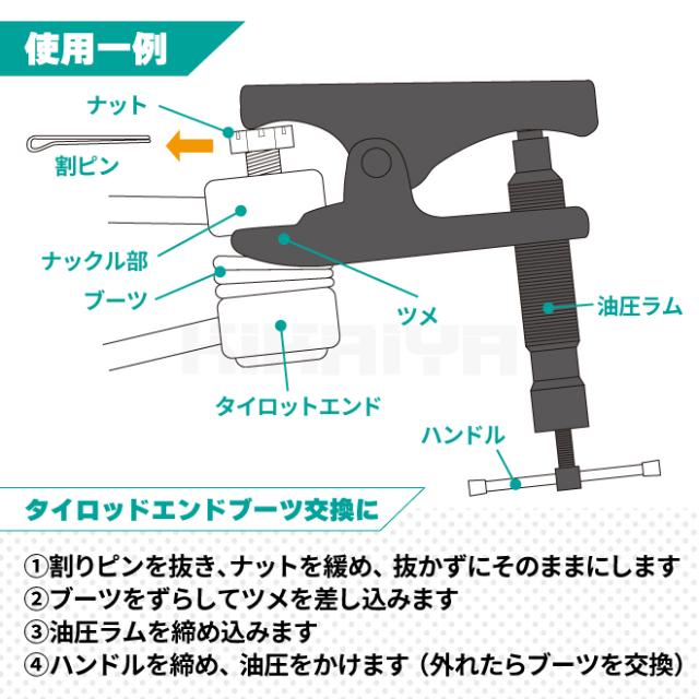 油圧とネジで強力パワー!足回りのメンテナンスに ●タイロッドエンドブーツの交換や、ハブベアリング、その他足回りのメンテナンスに ●油圧とネジで工具いらず!小型・中型トラック、SUV車などに最適 ●ネジ回転を油圧に変えるので、手動に比べ約3倍の強力なパワーを発揮 ●ボルトセットも同梱しており、2wayで使用可能(19mmレンチが必要です) ●ブーツ交換に使用する場合は、ジョイントの隙間にツメを差し込んで、 油圧ラムを締め込み、ハンドルで油圧をかければ外れます ●持ち運び、保管に便利なケース付 【ご注意】 ※ご使用前に必ずネジ部のゴミやホコリを取り除きグリスを塗ってください ※雨の中や水気の多い場所では使用しないでください (本製品は防水加工ではございません) ※伸ばした油圧ロッドを戻すには、ハンドルでネジを緩め、ロッドを下に向けて 上から強く押してください ※製品改良の為、予告なく仕様を変更する場合がございます 【例】(ケースサイズ・色・形・内容物の配置)等 ご使用に問題のない場合(返品/交換)はお受けしておりませんのでご了承ください ▼保証期間:6ヶ月 使用状況によっては保証対象外となる場合がございますので返送前に 必ずお問い合わせください (保証対象:油圧系統にかぎります) (保証対象外:[例]ダメージやオーバーロードによる変形・ゆがみ等、 使用による車輪の摩耗・水、塩分に起因する故障) 返送の送料はお客様負担でお願いいたします お客様によるイメージ違いでの返品は一切お受け出来ませんので予めご注意ください 品番:BJS-1 |