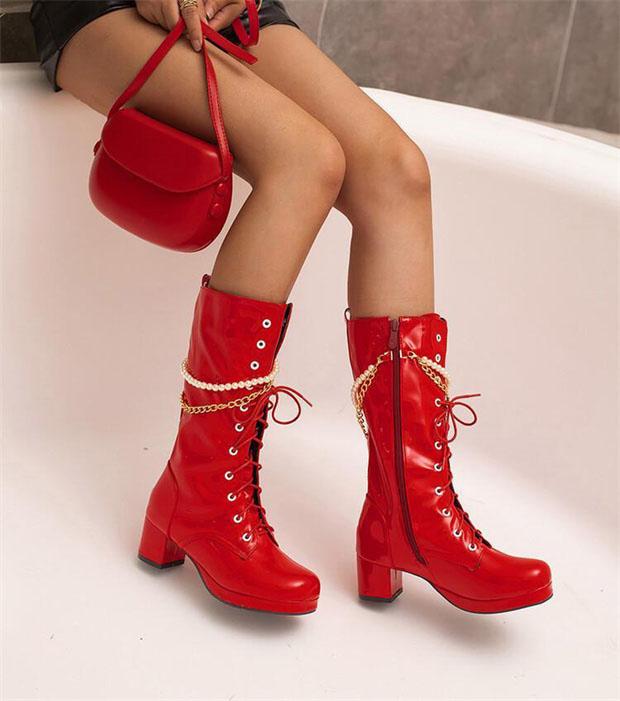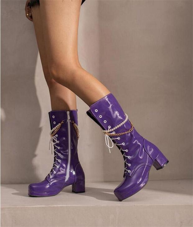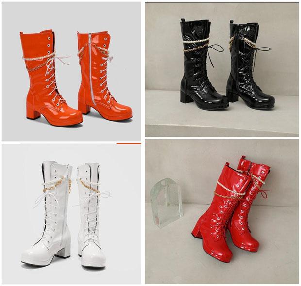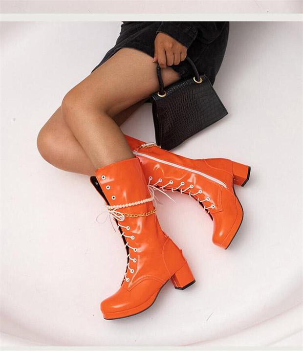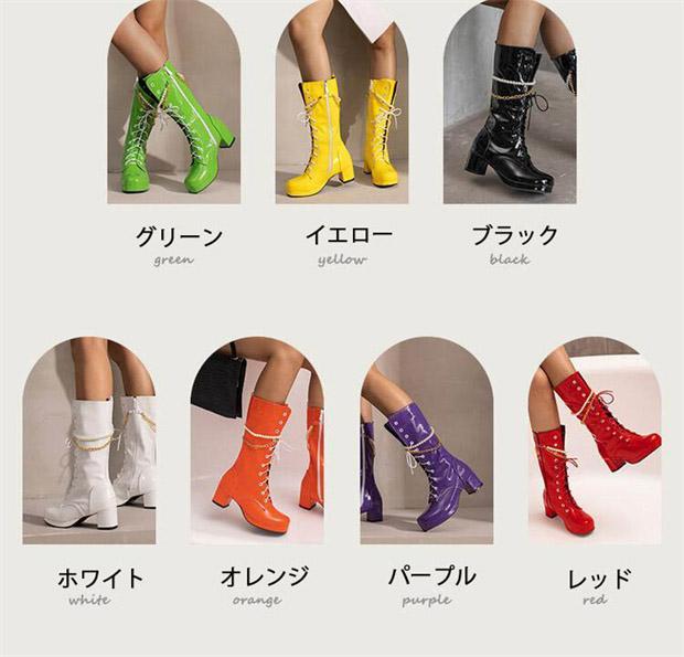 ロングブーツ 編み上げ ヒール5.5センチ 太ヒール ブーツ 美脚 カジュアル レディース シューズ 靴 秋 冬 春 20代 30代 40代 白 緑 イエロー オレンジ 赤 紫 黒 大きいサイズ 小さいサイズ20.0 21.0 21.5 25.5 26.0 26.5 27.0 28.5