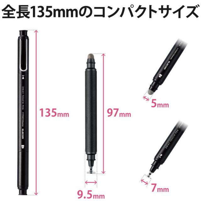 ■外形寸法:キャップ装着時:約135mm、キャップ非装着時:約97mm、本体部径:約9.5mm、導電繊維製ペン先径:約5mm、ディスク型ペン先径:約7mm