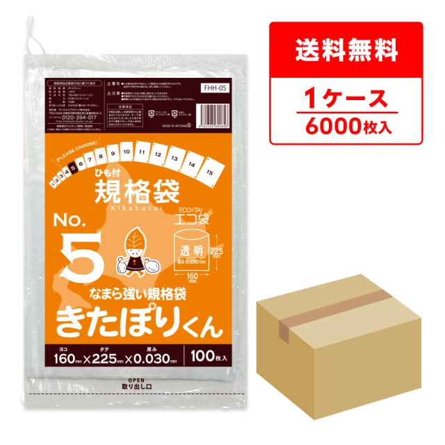 FHH-05 北海道規格 ひも付 規格袋 5号 0.030mm厚 透明 100枚x60冊 きたぽりくん 食品検査適合 RoHS指定 送料無料