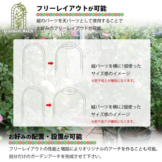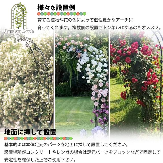 アーチとしてだけでの使用ではなく、支柱として使用したりお花を絡ませてお花のトンネルを作るなど仕様方法は様々。