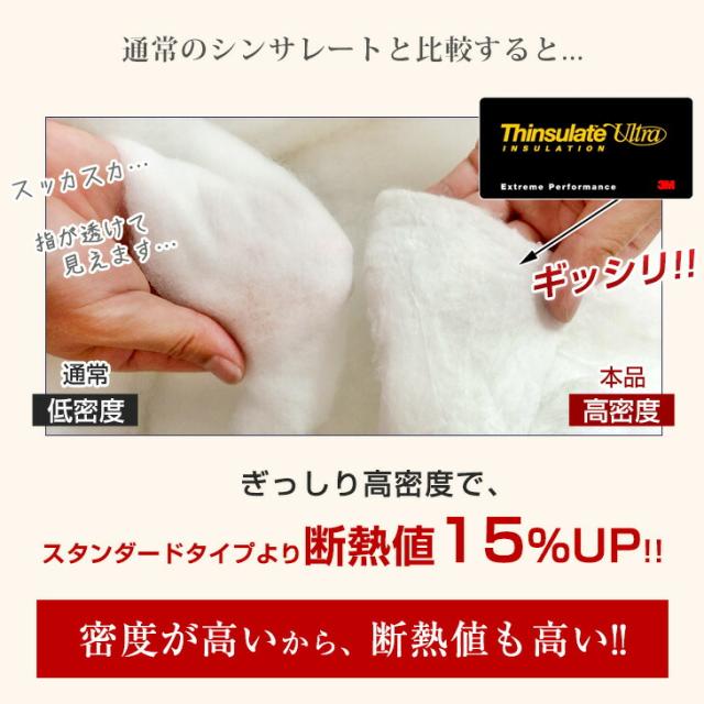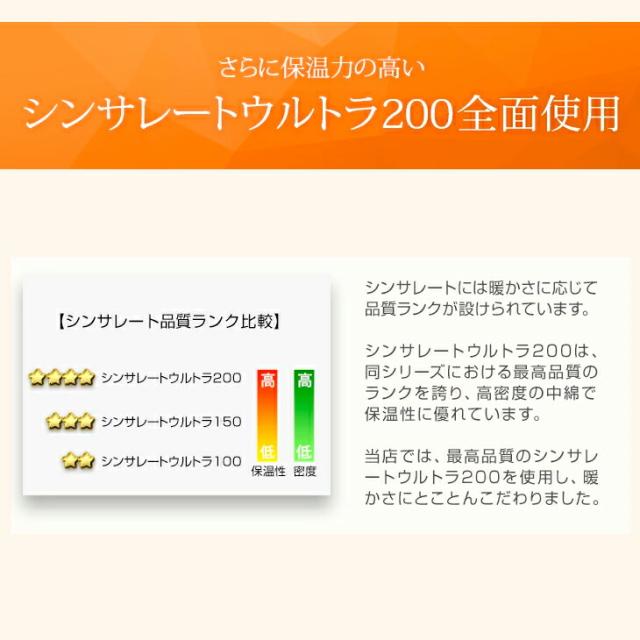 - 品質保証とも言える、商品に縫い付けられているスリーエムのタグ(ラベル)にシンサレートウルトラの表示は有りますが、そのランク(100or150or200)の表示は有りません。従って厳密に言うと、これだけ...
