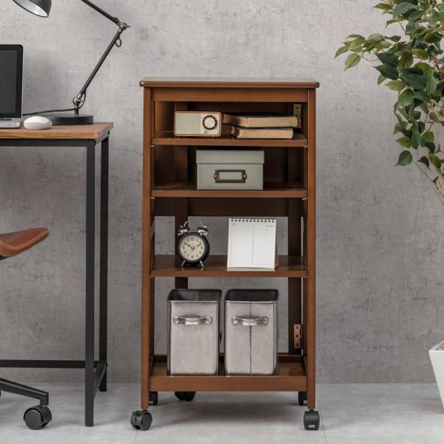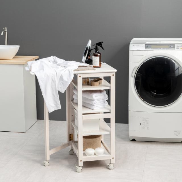 天板を広げない場合はコンパクトにラックとして収納でき、場所を取りません。キャスターも付いているので使いたいときにはサッと取り出し、片付けも簡単に行えます。