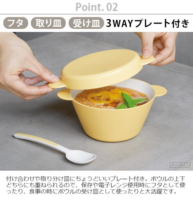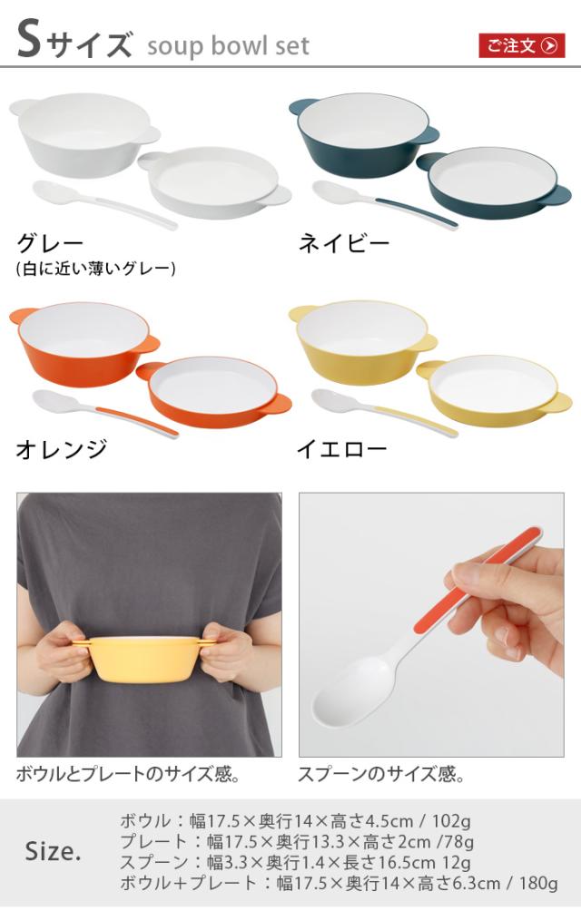 | ボウルM:(約)幅17.5×奥行14×高さ7cm プレート:(約)幅17.5×奥行13.3×高さ2cm スプーン:(約)幅3.3×奥行1.4×長さ16.5cm ボウル+プレート(フタとして使用した際):(約)幅17.5×奥行14×高さ8.7cm |