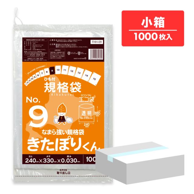【小箱販売】FHH-09kobako 北海道規格 ひも付 規格袋 9号 0.030mm厚 透明 100枚x10冊 きたぽりくん 食品検査適合 RoHS指定