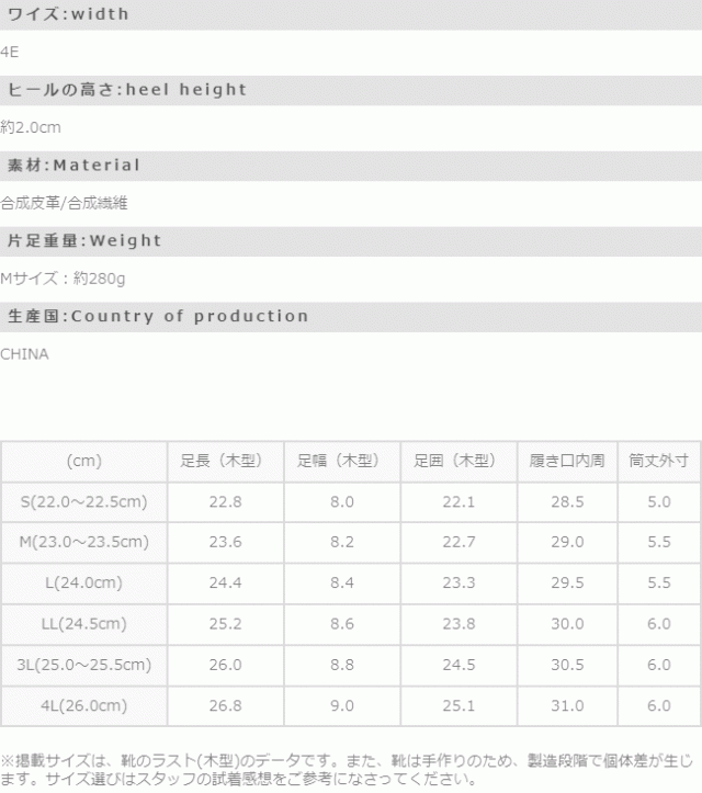 足長(木型):22.8cm/足幅(木型):8cm/履き口内周:28.5cm/筒丈:5cm/