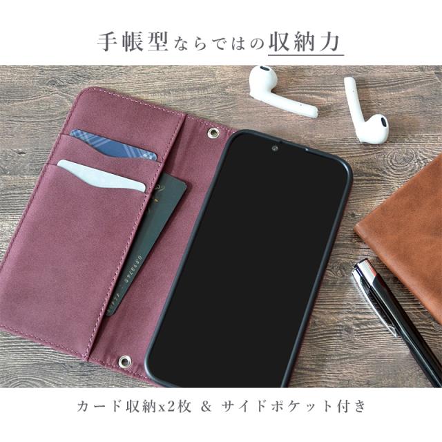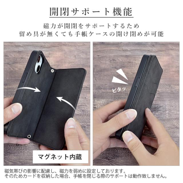 マグネットによる開閉サポート機能付きで、留め具が無くて使いやすいです。カードは2枚収納可能で、かつサイドから収納できるポケットも付いており、基本的な収納機能を完備。簡易なスタンド機能と、ストラップホール・ショートストラップも付いております。