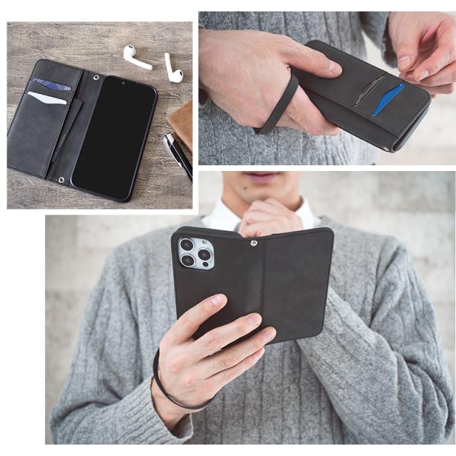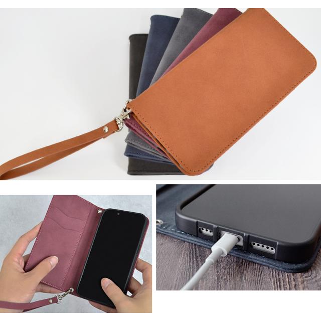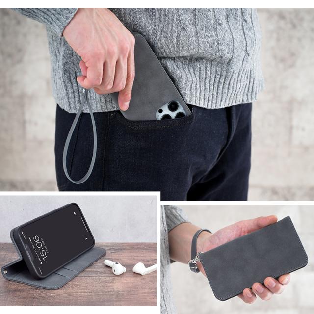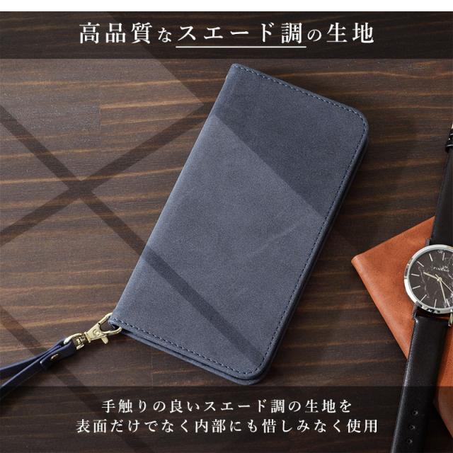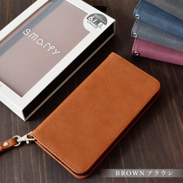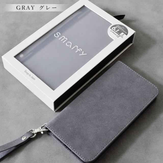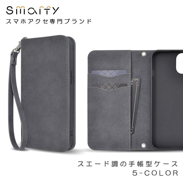 Smarfy(スマーフィー) ストラップ付きのiPhone手帳ケース。触り心地が良く高級感のあるスエード生地を使用した、男性も女性も使いやすいユニセックスデザインに仕上がっています。