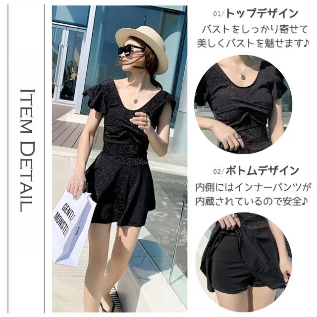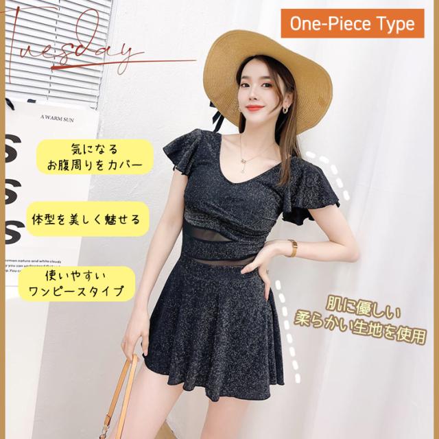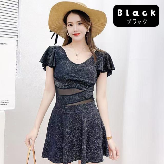 水着 レディース 体型カバー ワンピース 可愛い 女の子 女性 大人 体型 おしゃれ オールインワン フリル フレアスカート 無地 シンプル エレガント 10代 20代 30代 40代 中学生 高校生 大学生 ブラック 黒 肩出し M L
