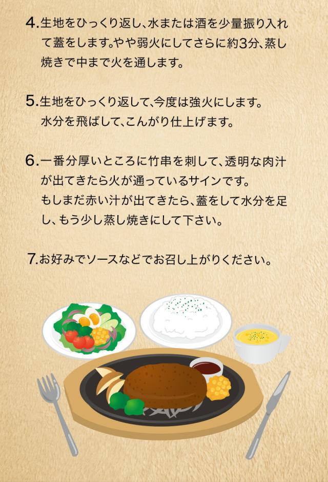 | 原材料 | 食肉等(牛肉、豚肉、牛脂)、ソテーオニオン、つなぎ(パン粉、卵白、牛乳)、トマトケチャップ、酵母系調味料、食塩、香辛料、(原材料の一部に卵、乳、小麦、大豆、牛肉、豚肉を含む) |