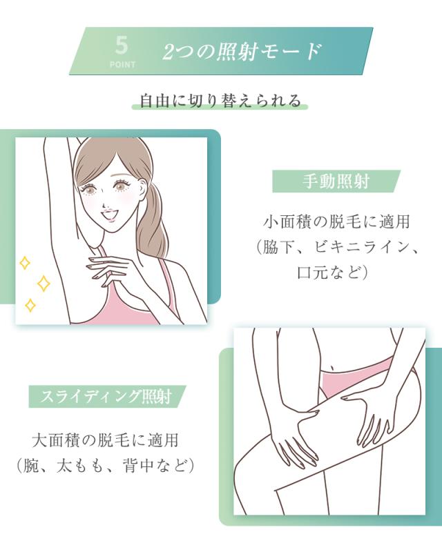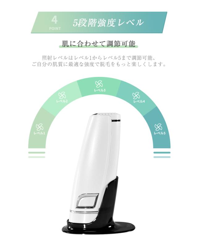 【5段階照射レベル&2つの照射モード】使用部位や肌質に合わせて、照射レベルが5階段に調節でき、ムダ毛ケアの効率がアップ!2つの照射モードを切り替えることができます。手動照射モードは小範囲の脱毛に適しており、自動照射モードは広範囲の脱毛に適しており、全身脱毛を実現できます。