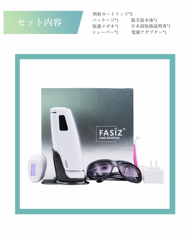 【セット内容】脱毛器×1台、電源アダプター×1つ、照射カートリッジ×2つ、保護メガネ×1つ、シェーバー×1つ、収納袋×1つ、日本語取扱説明書×1冊。