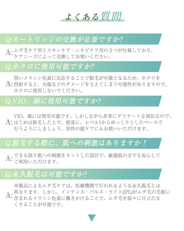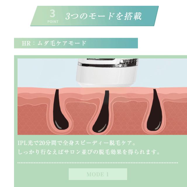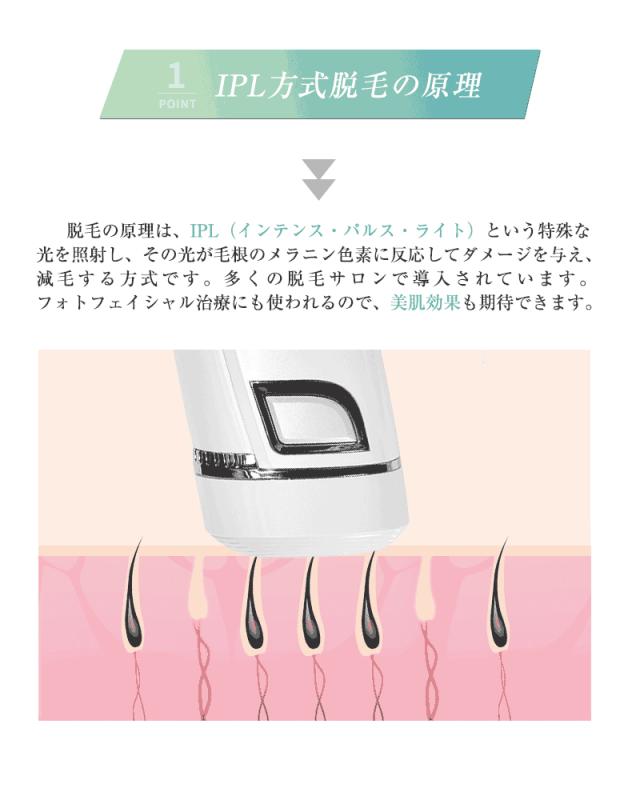 【IPL技術・交換用カートリッジ】IPL光は効果的に毛のメラニン色素に光を当てることで毛根にダメージを与え、ムダ毛を脱毛します。照射範囲が広く痛みも少ないため、初めての人でも安心して使うことができます。