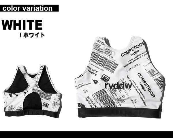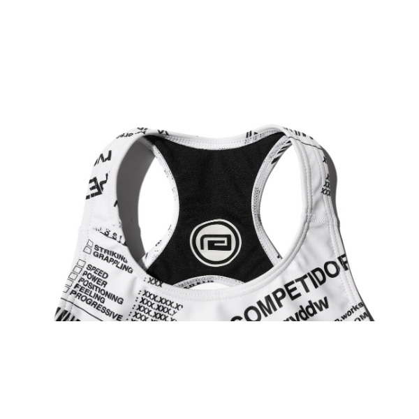「WMC(WORLD MARTIAL ARTS COMPETITION」がランダムに敷き詰められた総柄が魅力的なスポーツブラ。