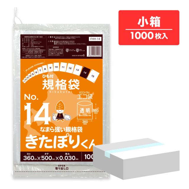 【小箱販売】FHH-14kobako 北海道規格 ひも付 規格袋 14号 0.030mm厚 透明 100枚x10冊 きたぽりくん 食品検査適合 RoHS指定