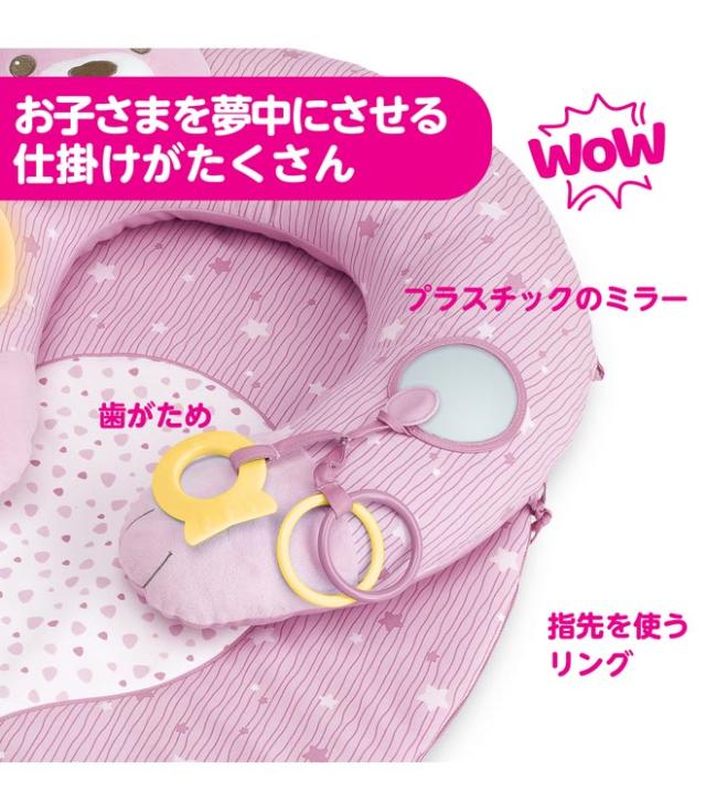 クッションに鏡や歯固め、手遊びリングが付いて
