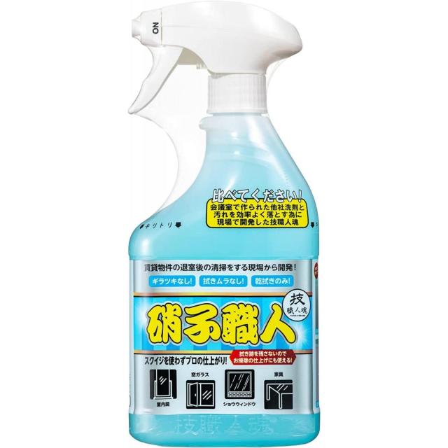 界面活性剤が発見されて約190年経った現在でも「新聞紙で拭く」や「息を吹きかけて拭く」などの知恵袋的な方法が囁かれます。 そのように以外と需要があるのに、重要視されてないのがガラス清掃用洗剤です。 しかしガラス清掃は実は難しく曇りのない仕上がりにするのがかなり厄介。どうしてもギラツキや、拭きムラが残ったり、ホコリが付着したりして仕上げるのにかなり大変です。 硝子職人はスクイジを使えないその日に来たアルバイトさんでも曇りのないプロの仕上がりを得られるように開発。 スプレイして乾拭きするだけで、西日の差した温度の上がったガラスのギラツキはもちろん、静電気の帯電を抑えてホコリの再付着を防ぎます。 スプレーして乾拭きをするだけで拭きムラやギラツキを抑えるので、ガラスだけでなく拭きムラを出したくないステンレスレンジフードやドア、石材類や室内鏡、照明で熱くなったショーケースなど拭き跡を残したくない様々な箇所にも使えます。 新築現場のクリーニングや、冷蔵庫、床などにもご使用いただけます!