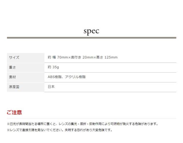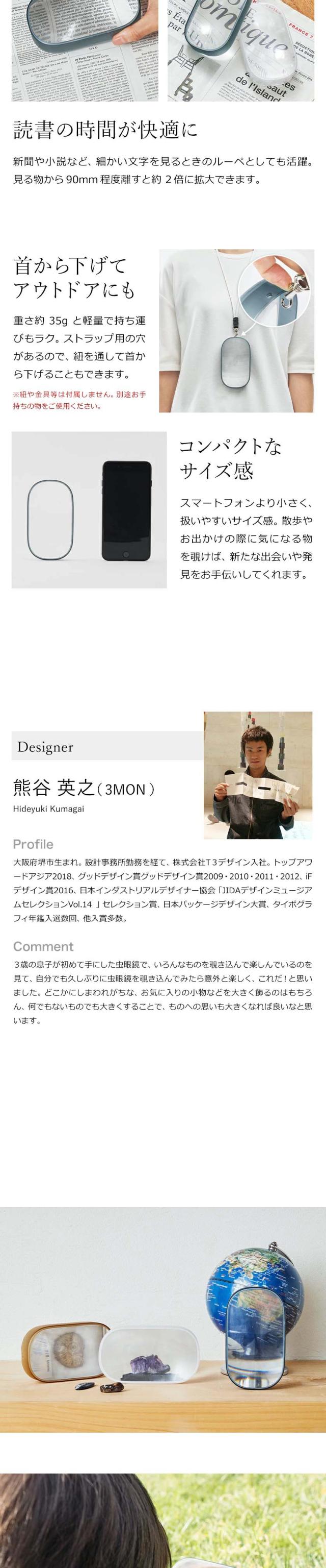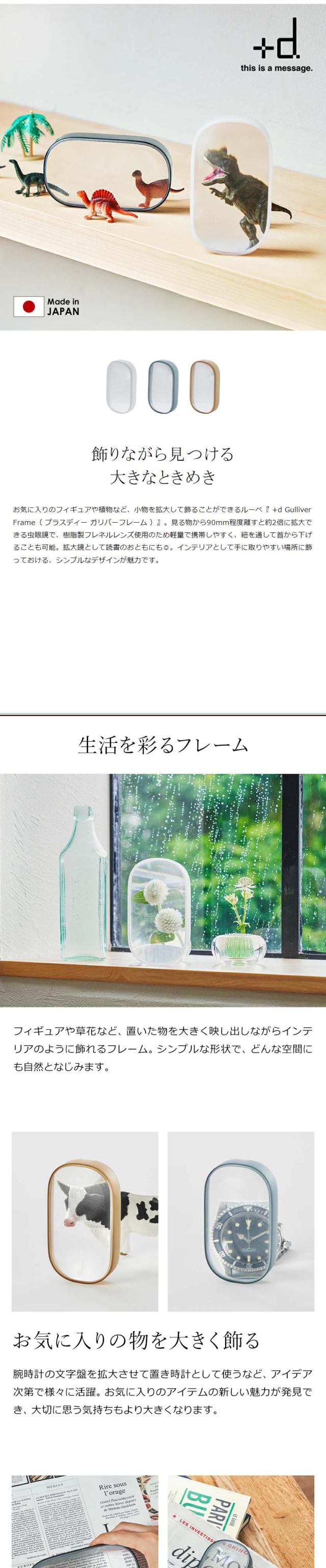 お気に入りのフィギュアや植物など、小物を拡大して飾ることができるルーペ『 +d Gulliver Frame( プラスディー ガリバーフレーム )』。見る物から90mm程度離すと約2倍に拡大できる虫眼鏡で、樹脂製フレネルレンズ使用のため軽量で携帯しやすく、紐を通して首から下げることも可能。拡大鏡として読書のおともにも◎。インテリアとして手に取りやすい場所に飾っておける、シンプルなデザインが魅力です。