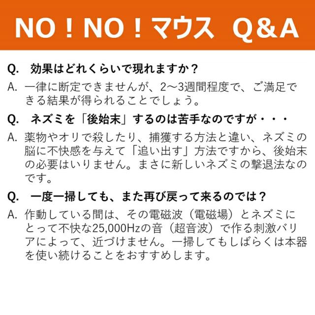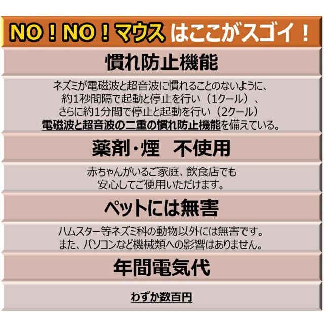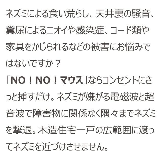 NO!NO!マウス ノーノーマウス ネズミ退治 ネズミを寄せ付けない ねずみ防除器 日本製 超音波ねずみ除去 使い方 マウスキラー おすすめ 人気 比較 ランキング 女性 男性 誕生日 母の日 父の日 敬老の日 クリスマス ギフト プレゼント 贈り物 電磁波と超音波でねずみ撃退 家庭 家 自宅 お店 飲食店 70坪対応 NONOマウス 口コミ ノーノーマウス クチコミ ねずみ除去機 レビュー 超音波 電磁波 ネズミ対策 評判 ねずみ対策器 通販