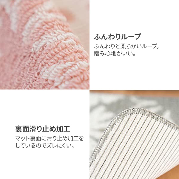 弾力のあるループ織りループ織りなので毛先から毛羽やホコリが出にくくなっています。衛生的に保ちたいキッチンにピッタリです。