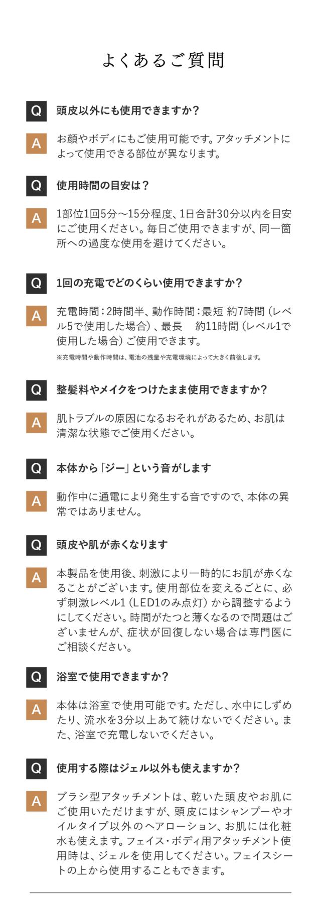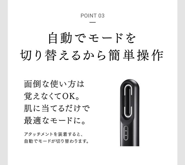 | ●パッケージ内容 | 本体:1台 アタッチメント:3種類(ブラシ型/フェイス型/ボディ型) 充電台:1台 専用AC充電器(ACアダプター):1個 取扱説明書:1部 |