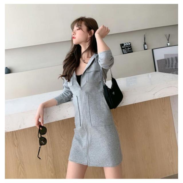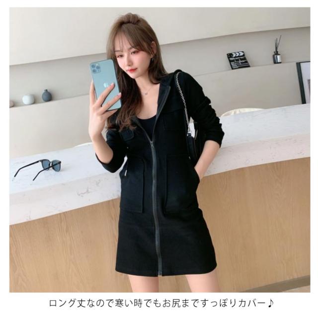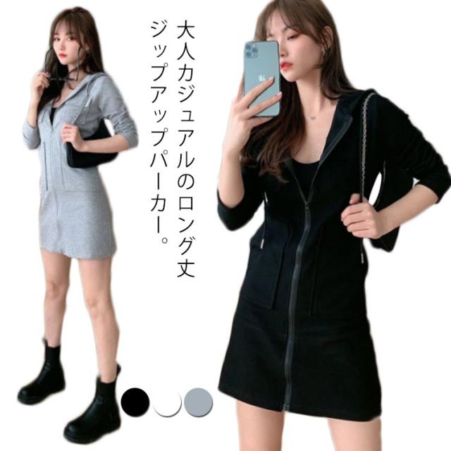 ロングジップパーカー タイトパーカー レディース 春秋 冬 アウター ワンピース パーカーワンピース 大人 ロング丈 ワンピ ロング ひざ丈 ライトアウター 黒 白 ブラック ホワイト グレー オフィス 長袖 20代 30代 40代 OL ママ 母