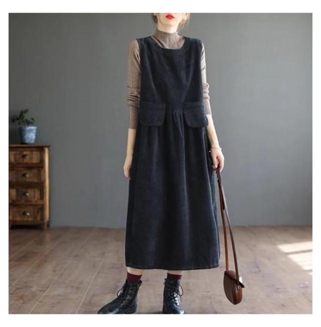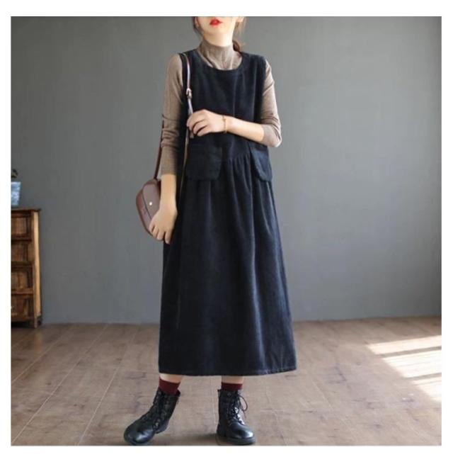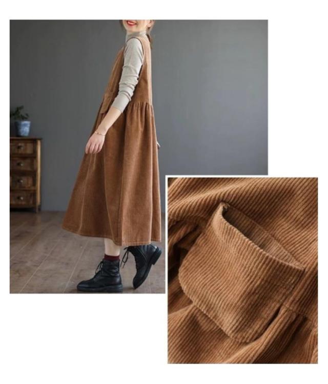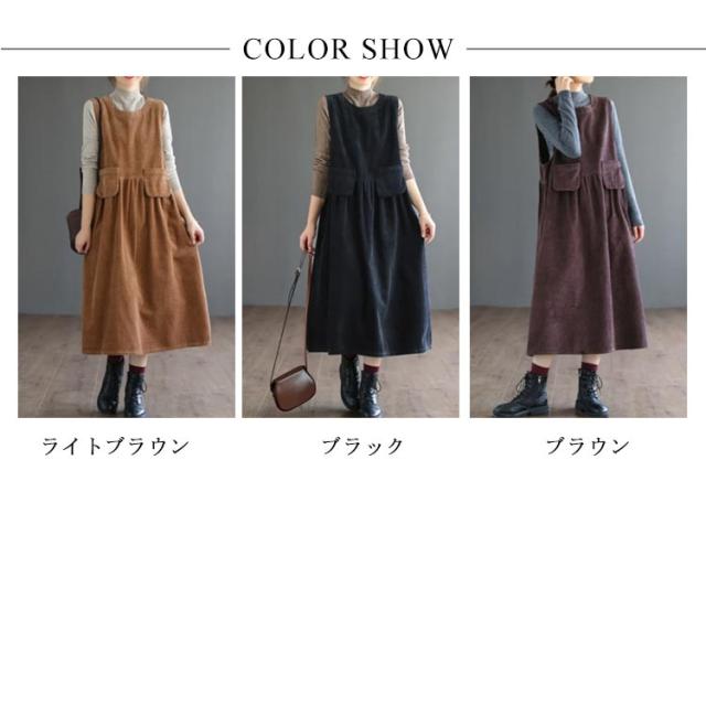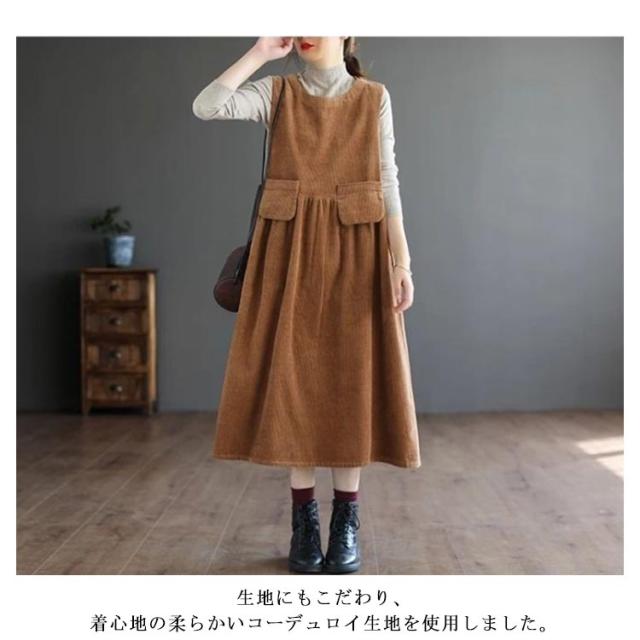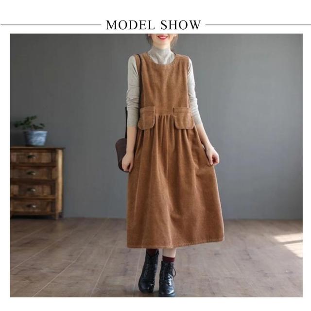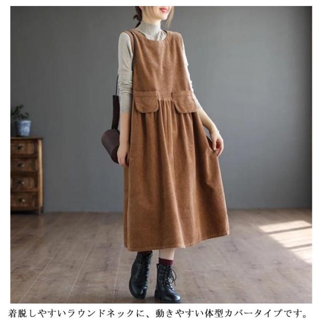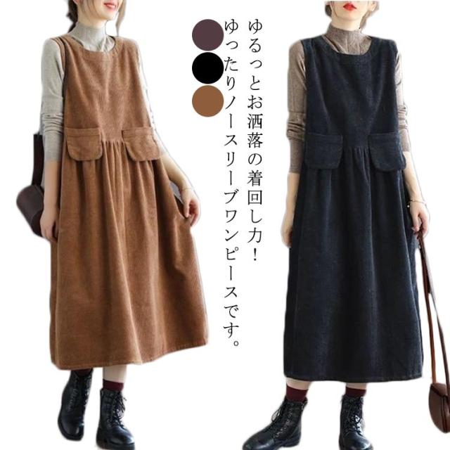 コーデュロイ サロペット ワンピース レディース ロングワンピース ノースリーブ ラウンドネック 春秋 冬 Aライン 体型カバー ポケット付き カジュアル M L XL 2XL 3XL
