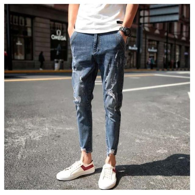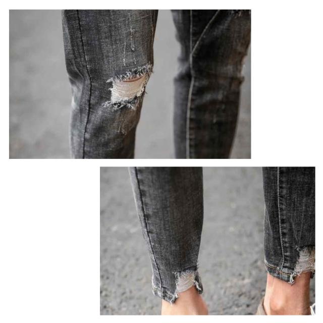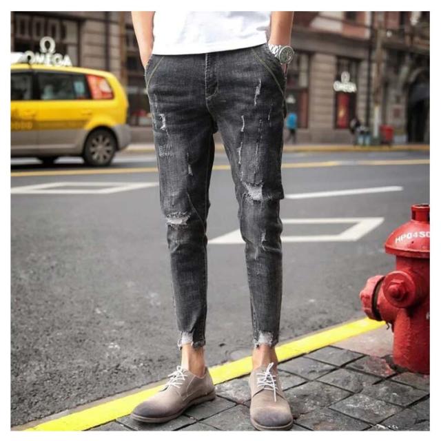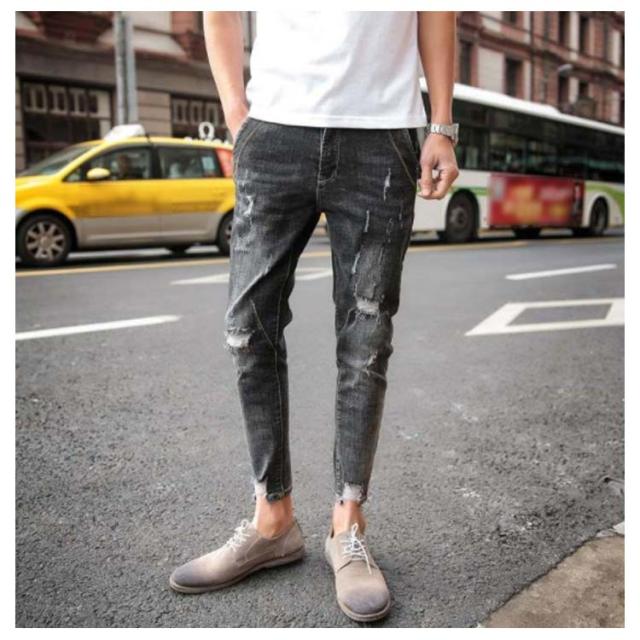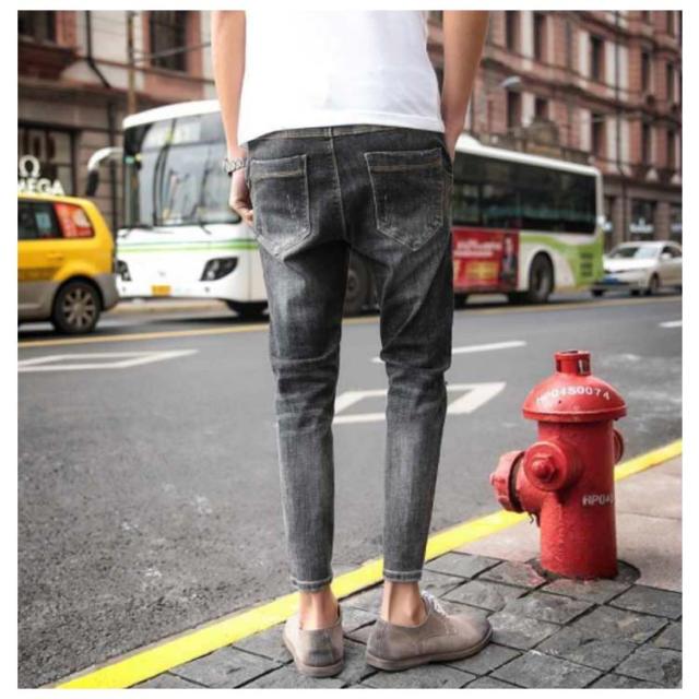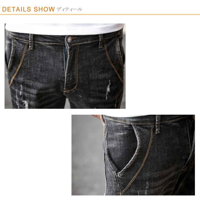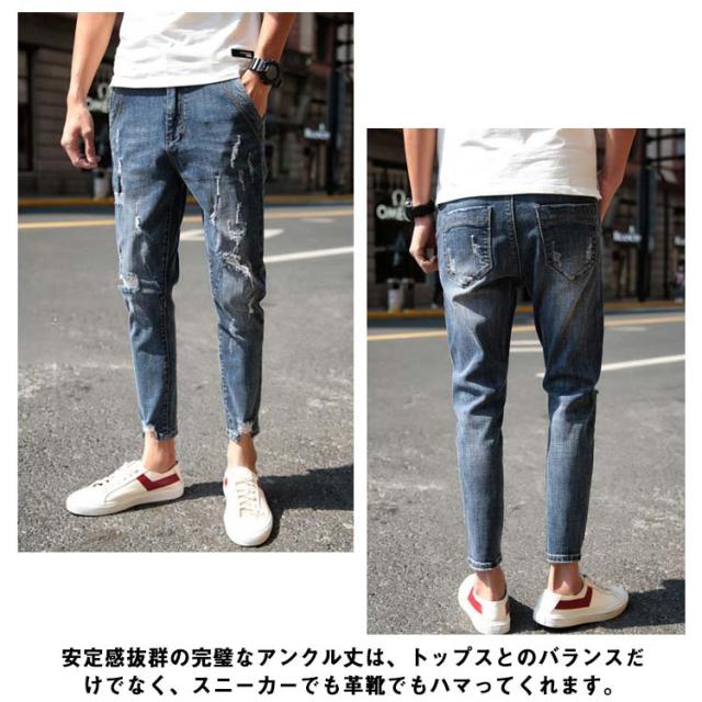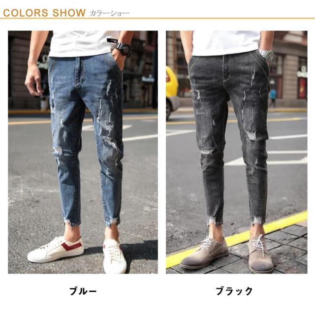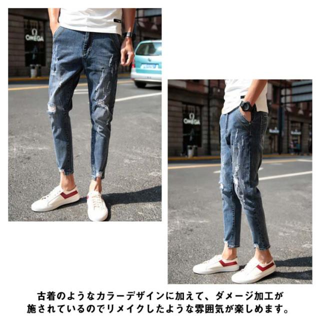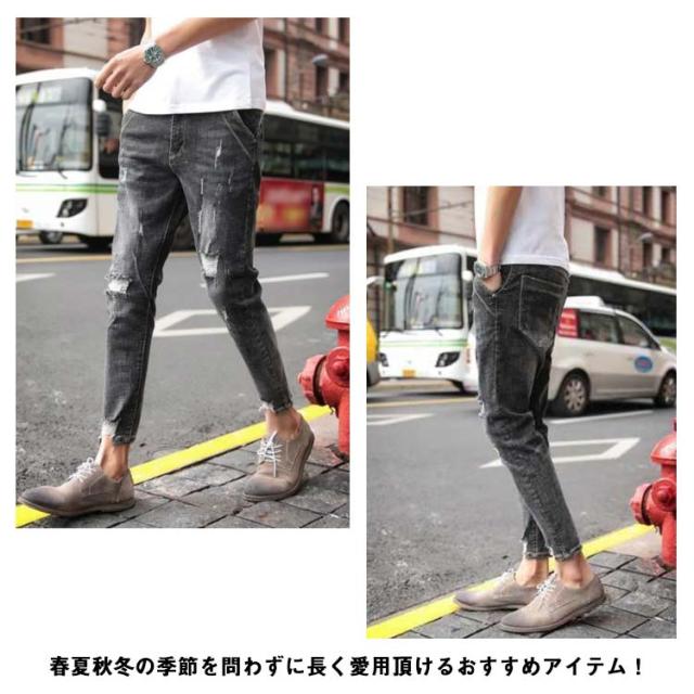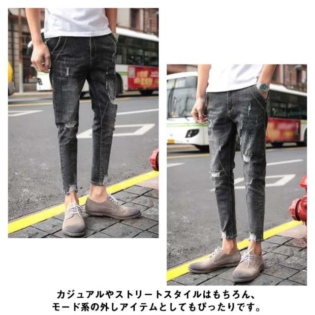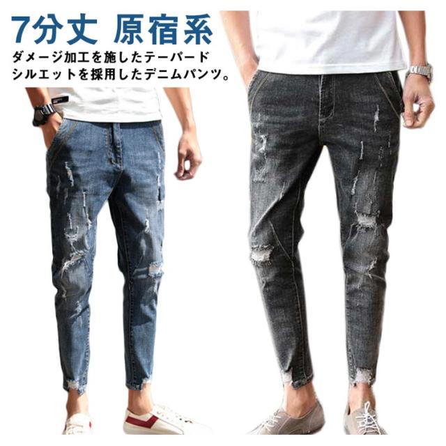 【送料無料】デニム テーパードパンツ ダメージ メンズ ジーンズ ジーパン スリム 7分丈 アメカジ ウォッシュ加工 古着風 ストリート 原宿系 ブラック 黒 Gパン デニムパンツ アンクル丈 春夏秋冬 ボトムス おしゃれ