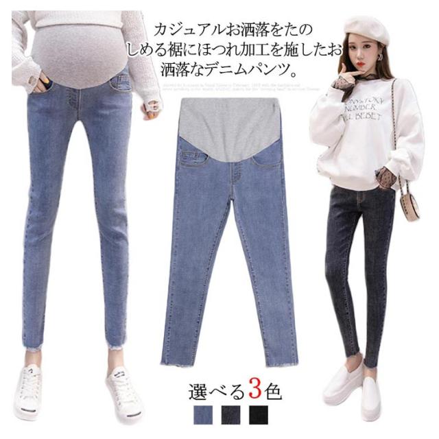 | カジュアルお洒落をたのしめる裾にほつれ加工を施したお洒落なデニムパンツ。 毎日のコーデとも合わせやすく1枚持っているととっても便利なアイテムです。 伸縮性のあるデニム素材を使用、動きやすくフィット感も抜群、美脚効果も◎ ウエストにはアジャスト機能付き、妊娠初期から産後まで履けるデザインです。 お腹周りもお腹の大きさに合わせて、伸縮できるような素材を使用、お腹周りにフィットしお腹を優しくサポートします。 | |