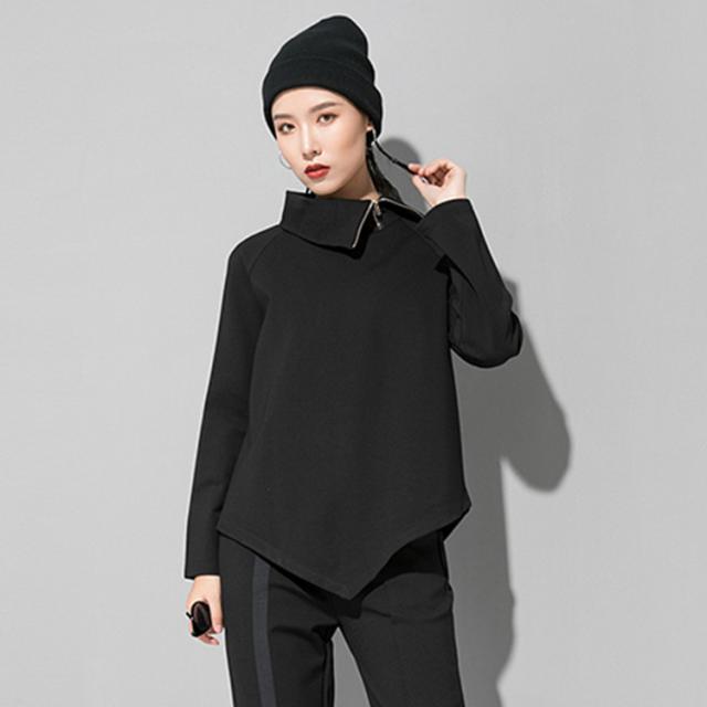 ジッパー付きのハイネックにアシンメトリーでシンプルなトップス。