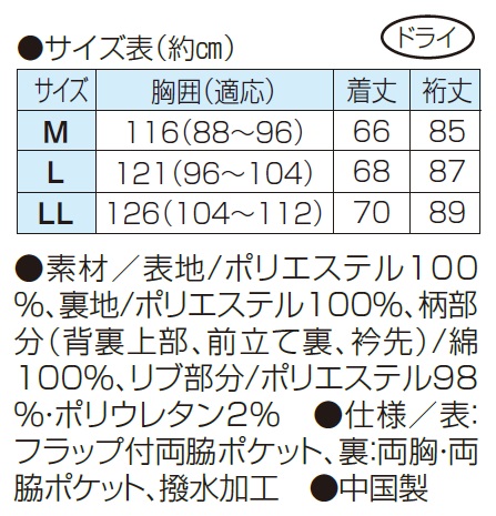 ●仕様/表:フラップ付両脇ポケット、裏:両胸・両脇ポケット、撥水加工