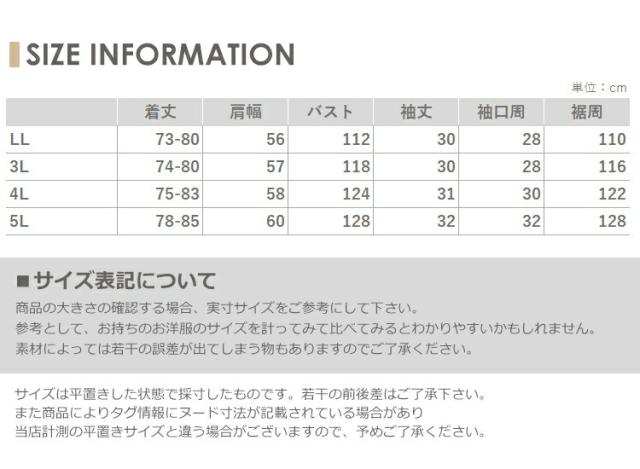 3L:着丈74-80 肩幅57 バスト118 袖丈30 袖口周28 裾周116