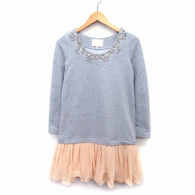 【中古】チェスティ Chesty 切替 ワンピース ミニ 長袖 丸首 ビジュー装飾 ギャザー 綿混 0 グレー 灰 ライトベージュ