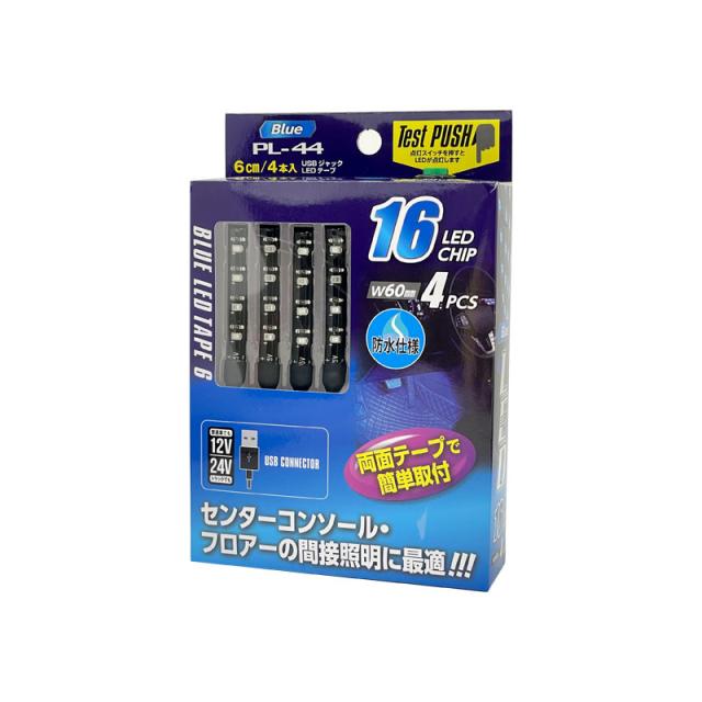 プロキオン USB端子LEDテープ 6cm×4本 ブルー 間接照明 車内 両面テープ イルミネーション 車 DC12/24V 防水仕様 5V PL-44