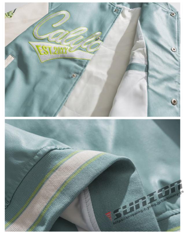 ◎トレンドとベーシックを兼ね備えたバイカラーの配色がポイントのT/C裏毛ワッペン刺繍スタジャン。