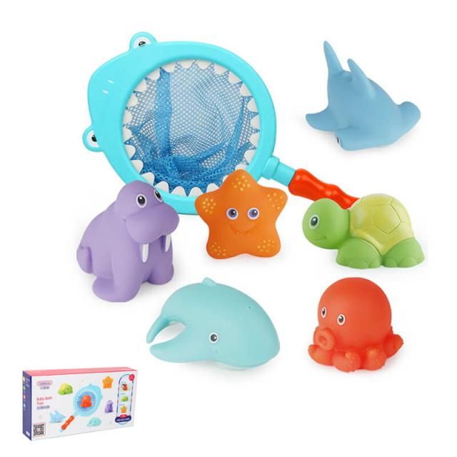 お風呂 おもちゃ おふろ 水遊びおもちゃ シャワー プール おもちゃ 7点セット 噴水 音出す動物 漁網 柔らかい 子供 おもちゃ