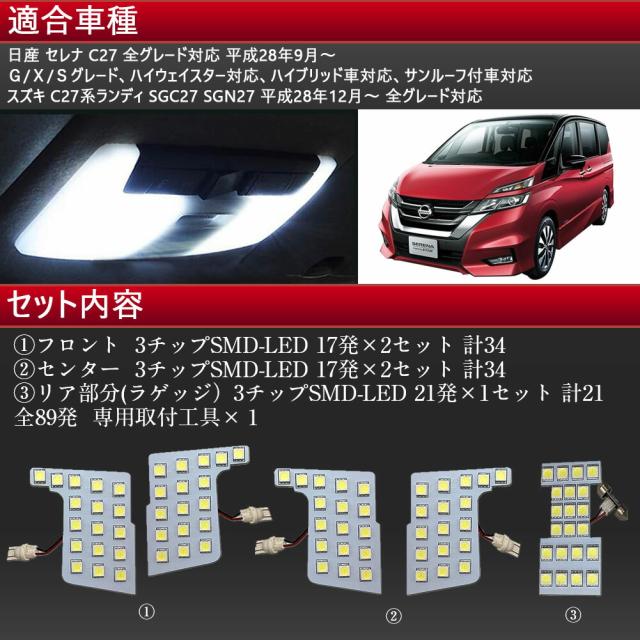 ルームランプセット LED ルームランプ 室内灯 ルーム球 車内灯 超白輝光ルームランプ89連 日産 新型 セレナ C27 全グレード対応 ランディ SGC27 3チップSMD